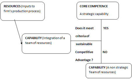 Resources are inputs to a firm in the production process. These can be human, financial, technological, physical or organizational. The more unique, valuable and firm specialized the resources are, the more possibly the firm will have core competency.