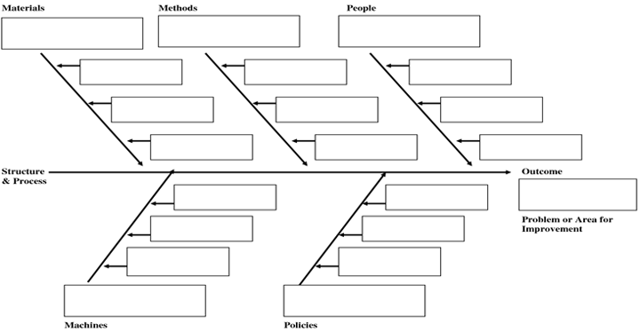 Specific Causes as Branches: Once these categories have been created, it is time to brainstorm. One of the most common methods is to select a category and go to every person one by one for suggestions. Every person can make only one suggestion in one round. If they do not have a suggestion they say pass. This must be continued till most people in the group are saying pass. Once all the possible causes have been listed out as sub-branches in the category, move on to the next category. Repeat till the diagram is full.